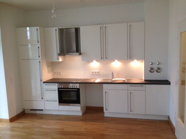 Wohn-/Essbereich mit offener Küche und Zugang zur Terrasse, Schlafzimmer, Duschbad, Flur, 1 Kellerraum. Eine moderne Einbauküche; hochwertiges Bad mit Naturfliesen, Dusche, Handwaschbecken und WC, Waschmaschinenanschluss. Fernwärme mit zentraler Warmwasserversorgung.