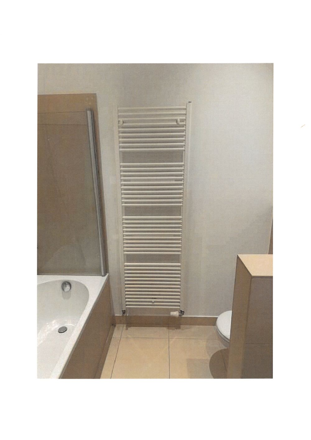 Hochwertiges Bad mit Natursteinfliesen mit Badewanne, Handwaschbecken, Handtuchheizkörper und WC, Waschmaschinenanschluss;