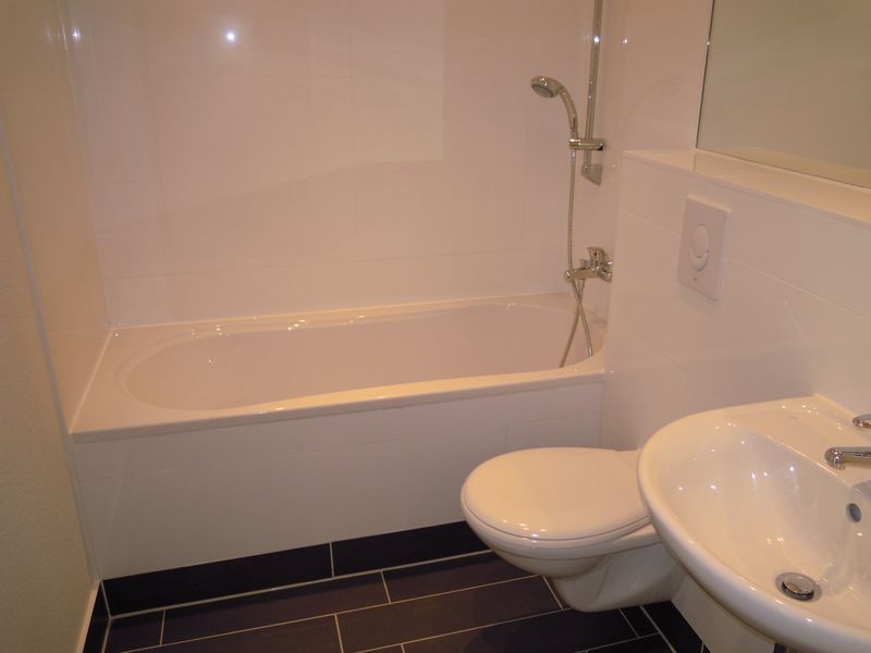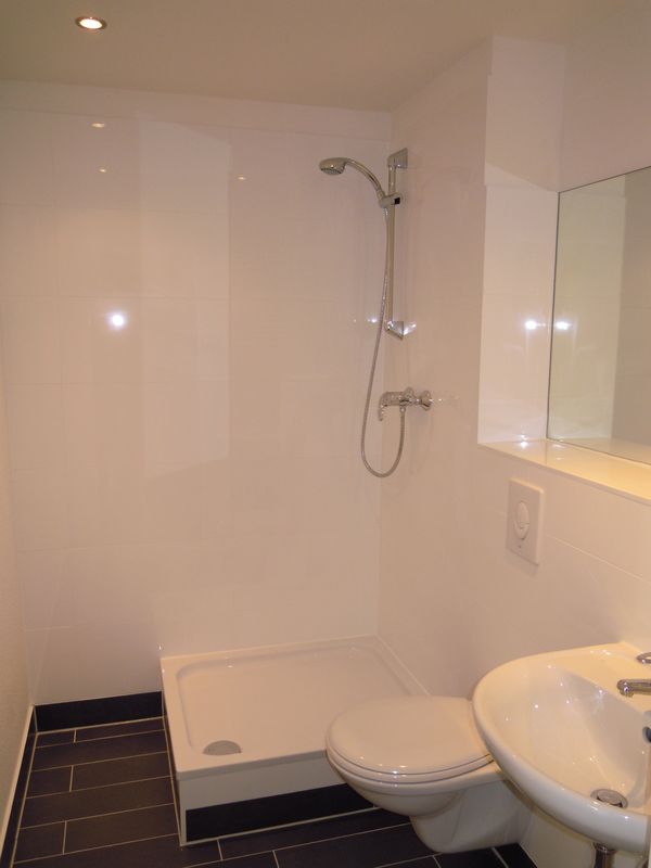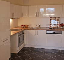 Laminatboden, Hochglanz-Einbauküche m it Elektroherd, Cerankochfeld und Dunsthaube, Modernisierte Innentüren, Halogendeckenspots, ein Wannenbad und ein separates Duschbad und Balkon.
