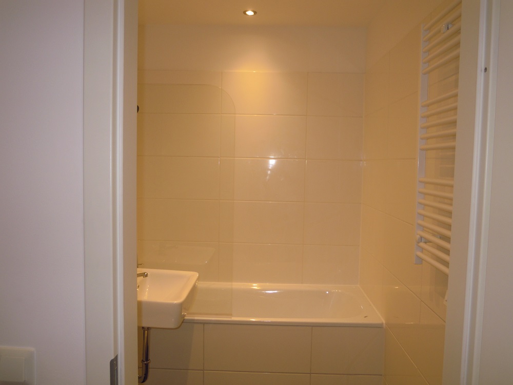 Bad mit Wanne, WC, Handwaschbecken und Handtuchheizkörper;