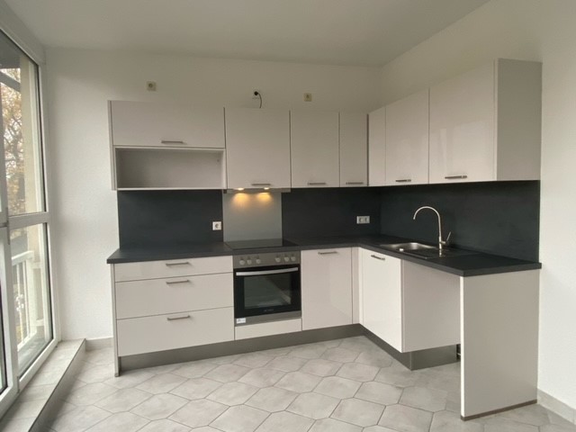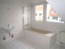 neue, moderne Einbauküche; Dachterrasse; Weiß-grau-marmoriert-gefliestes Bad mit Badewanne und Handwaschbecken. Weiße Sanitärobjekte. Laminat; Gas-Zentralheizung.