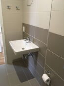 modernes Bad mit bodentiefer Dusche, beheiztem Handtuchhalter als Heizkörper, Waschmaschinenanschluss vor dem Bad;